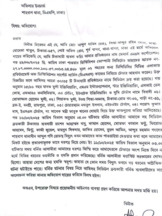 ১৯/১০/২০২৫ তারিখের অভিযোগ কপি সংযুক্তি।